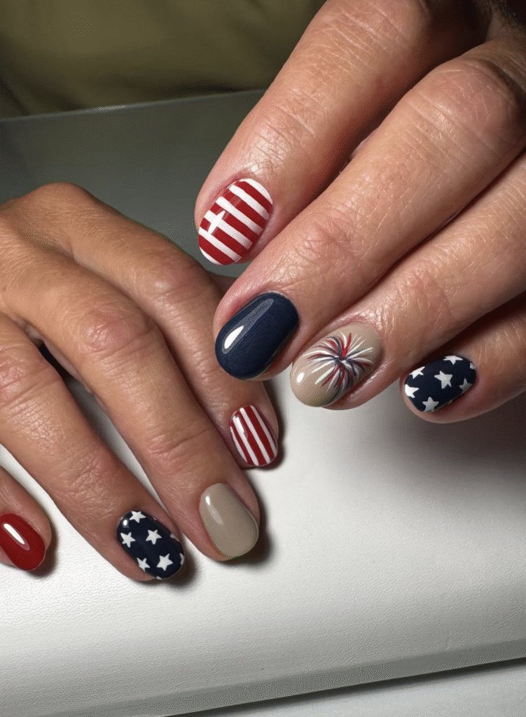 Let’s start with a bang—literally! Go for a dark navy or black base and add red, white, and blue fireworks bursting from the center of your nails. Add some glitter or rhinestones to mimic the sparkle of real fireworks. Instant party on your hands!