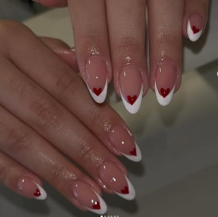 French tips get a Valentine upgrade with pink or red heart on it . Elegant, trendy, and perfect for date night.