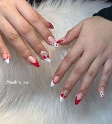 Swap the classic white tip for a red one. Red French tips on almond nails are sleek, romantic, and incredibly trendy right now.