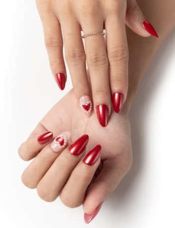 It’s no surprise that the almond Valentine nail trend is taking over this year. From classic reds to soft pinks, glitter accents, and heart designs, almond nails make every look feel more stylish and romantic.