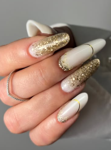Create a gold glitter half-moon at the base of nude nails for a chic, vintage-inspired look.