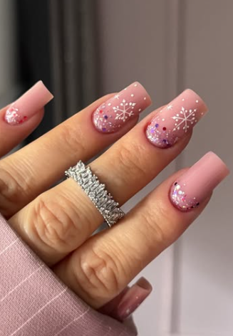 A delicate nude base with small white snowflakes hand-painted on one or two nails is winter elegance at its best.