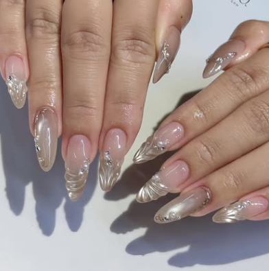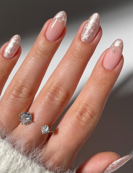Add small pearl studs on nude nails for an elegant, almost bridal look that feels perfect for Christmas.