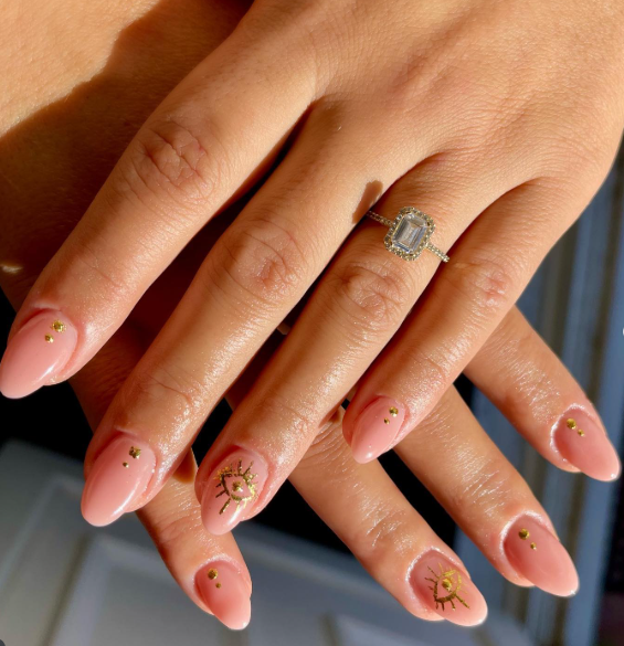 A sheer nude polish with scattered gold dots feels like delicate holiday confetti.