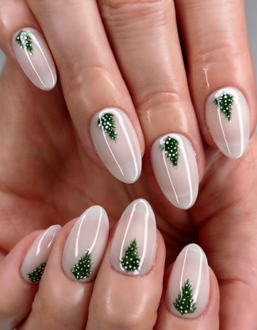 One or two nails featuring simple, thin pine tree shapes on nude backgrounds add a festive nod without overpowering.
