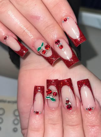 A matte nude base with glossy, deep red tips gives a classy Christmas twist on the French manicure.