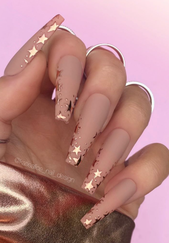 A soft nude fade from light to darker shades paired with shimmering gold foil adds a luxurious touch.