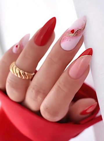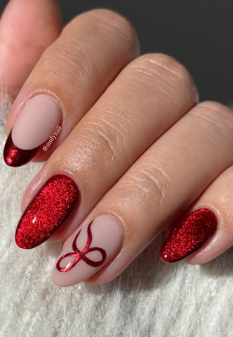 A soft nude polish with one or two nails coated in red glitter balances subtlety and sparkle.