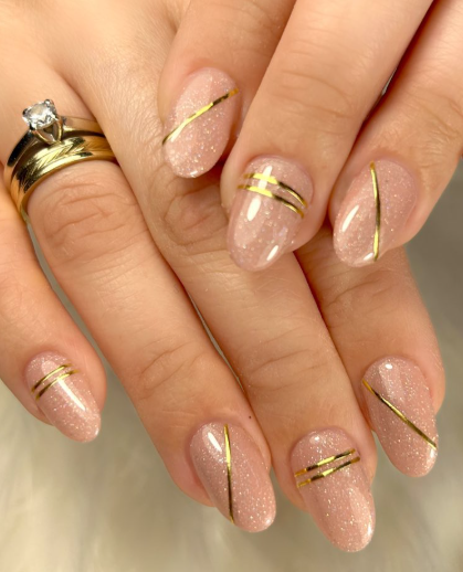 Start with a soft nude base and add a thin gold glitter stripe or accent nail. It’s simple but instantly festive.