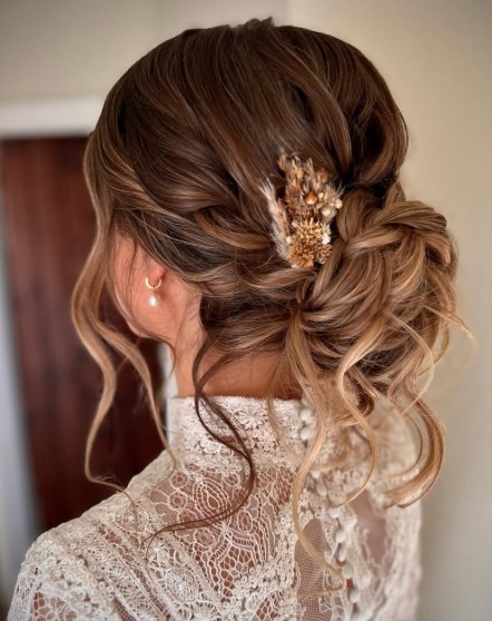 Letting a few curls fall naturally keeps the look light and romantic.