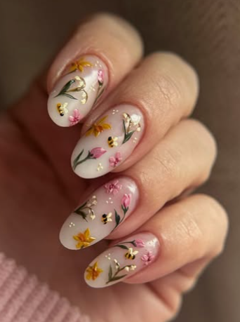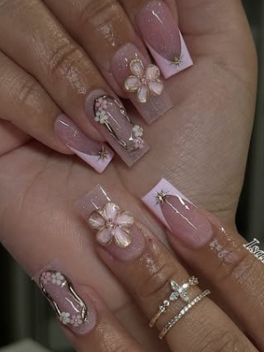 Pink florals on a sheer base make for soft, romantic Barbie nails—perfect for spring or weddings.