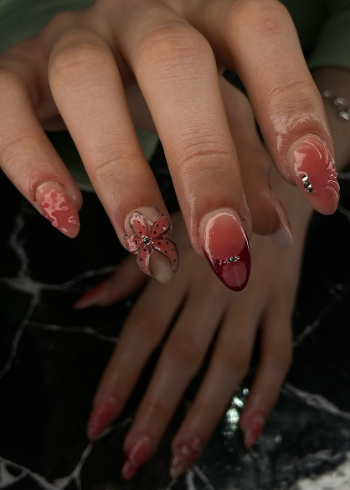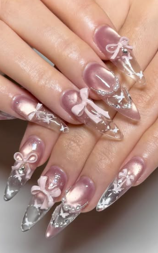 Add cute 3D bow charms on your accent nails. It gives your nails a playful and adorable finish.