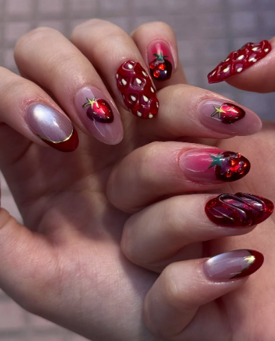 Pink nails with cute strawberry art? Yes, please! So fun and totally Insta-worthy.