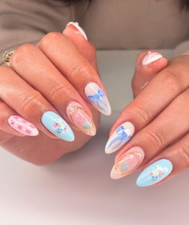 Tiny hearts mixed with floral designs create a sweet, romantic spring look. It’s cute without feeling childish—perfect for Easter season.