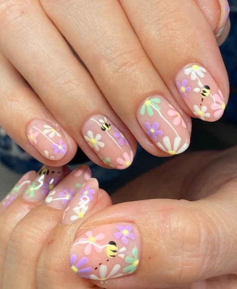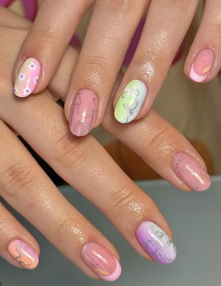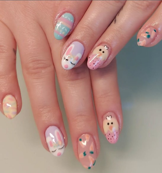 Inspired by decorated Easter eggs, these nails feature dots, soft lines, and mixed pastel colors. They’re festive, fun, and perfect for celebrating the season.