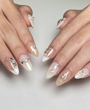 A nude base with tiny rhinestones near the cuticle adds just enough glam. It’s classy but eye-catching.
