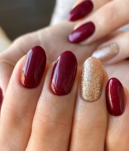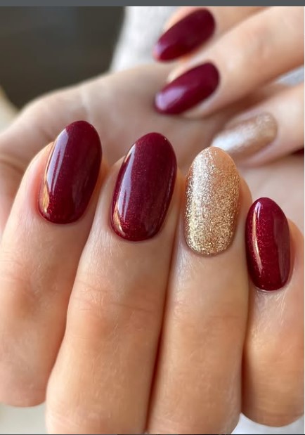 For a little extra sparkle, keep most nails red and paint one or two nails in glittery gold. It’s festive without being overwhelming, and it instantly elevates your mani.
