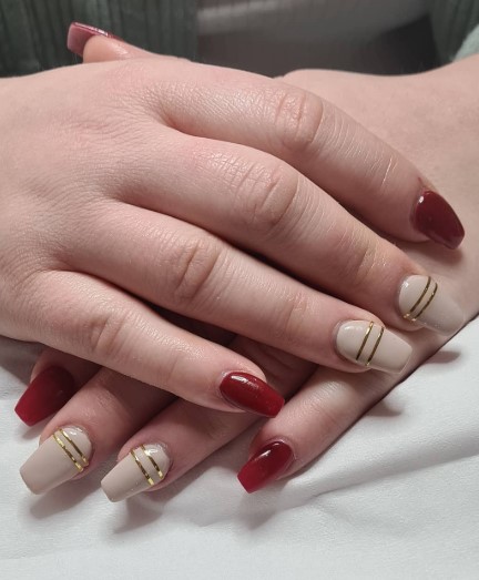 For a modern, minimal vibe, paint your nails red and add a thin gold line horizontally or vertically on each nail. This one is clean, sleek, and totally on-trend.