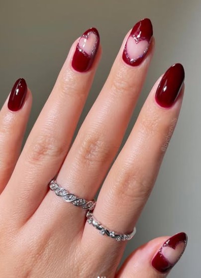 Start with a red base and use gold glitter to form a heart shape on one or two nail. It’s so cute, and trust me, you’ll catch everyone’s attention.