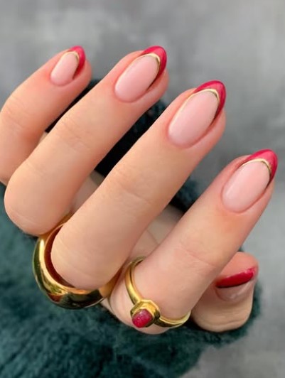 Start simple: a bold, glossy red as the main color, with delicate gold tips. It’s a modern twist on French tips that feels romantic and classy.