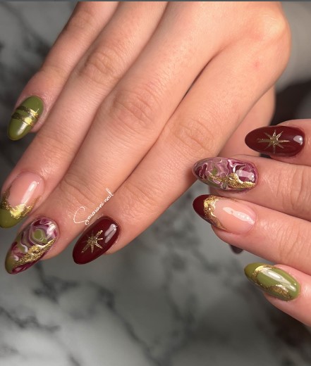 Add some drama with gold foil accents. Dab them randomly on nails for a luxurious, artful look that feels high-end without needing a salon visit.
