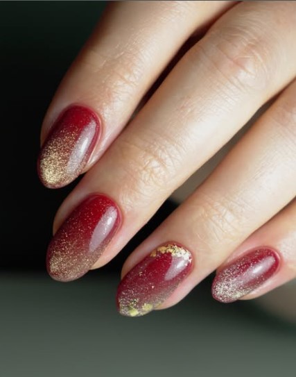 Instead of glitter, try gold foil tips for a rich, luxurious look. The contrast between the deep red and metallic gold is chef’s kiss perfection.